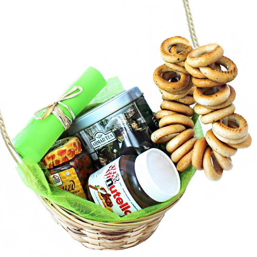 Состав: корзина, паста Нутела, чай Ахмад Эрл Грей ж/б, мед с орехами, поздравление, декор, сушки.