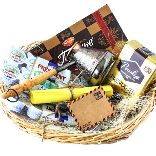 Состав: 2 пачки сливок, кофе, турка, Суфле Птичье молоко, конвертик декор, поздравление, корзина.