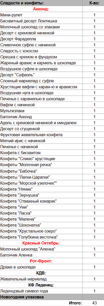 Мини-рулет (1 шт), Бисквитный десерт Ломтишка (1 шт), Молочный шоколад со злаками (1 шт), Десерт с кремовой начинкой (1 шт), Десерт Фараделла (1 шт), Cливочное суфле с начинкой (1 шт), Сладость с кокосом (1 шт), Орешка с кремом и фундуком (1 шт), Жареный арахис и кармель в шоколаде (1 шт), Воздушное суфле в шоколаде (1 шт), Десерт "Суфаэль" (1 шт), Слоеный мармелад с суфле (1 шт), Хрустящие вафли с карам-ю и арахисом (1 шт), Воздушная нуга в шоколаде (1 шт), Печенье с карамелью в шоколаде (1 шт), Вафли с начинкой (1 шт), Мультизлаки (1 шт), Батончик Акконд (1 шт), Адель с кремовой начинкой и миндалем (1 шт), Десерт со сгущенкой (1 шт), Фруктовая жевательная конфета (1 шт), Мягкий ирис с начинкой (1 шт), Печенье с начинкой (1 шт), Конфета с бисквитом (1 шт), Молочный шоколад "Аленка" (1 шт), Батончик Аленка (1 шт), Драже в шоколаде (1 шт), Жевательный мармелад (1 шт), Леденцовый символ года (1 шт)