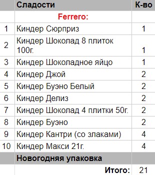 Кол-во сладостей: 21 шт.