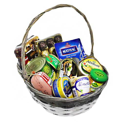 Состав : Корзина, икра красная, шпроты, печень трески, горчица зерновая, филе сельди, конфеты Ferrero Collection 172 гр, колбаса молочная -500 гр, колбаса Брауншвейская 240 гр, ананасы консервированные, печенье имбирное, сыр Natura 400 гр, сыр альметто мягкий