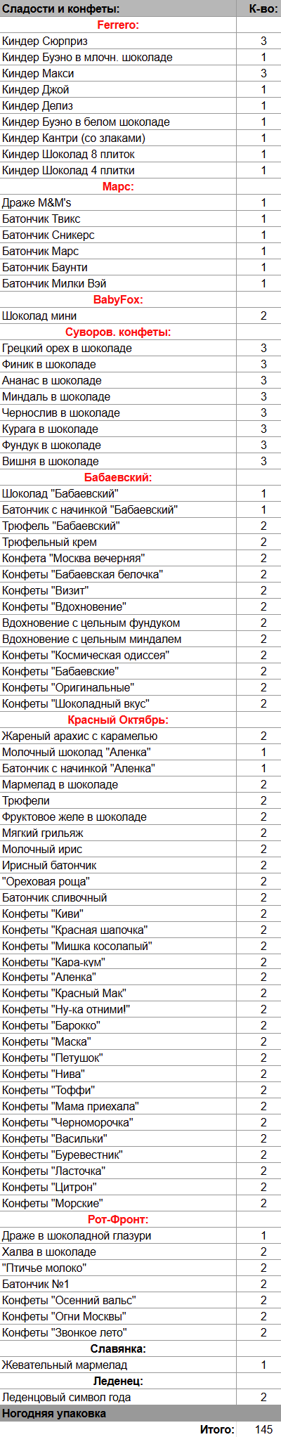 Интернет-магазин сладких новогодних подарков работает от производителя напрямую, за счет чего мы убираем посредников и снижаем цены на детские новогодние подарки. Кроме того, наша логистика позволяет доставить заказ практически в любой город за наш счет. Все цены на сладкие подарки актуальны